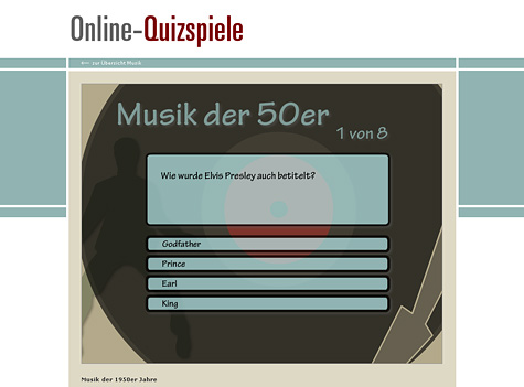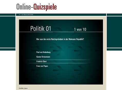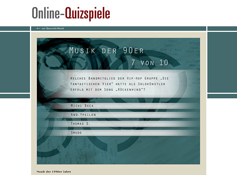 Leistungen: Konzeption, Layout und Umsetzung der Internetseite. Entwicklung, Layout und Umsetzung der Quizsoftware und des Quiz.