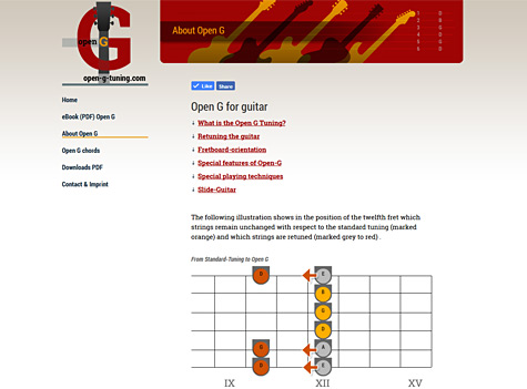 Englischsprachige Website über die offene G-Stimmung auf der Gitarre mit Online-Übungstools, Downloads und PDF eBook.